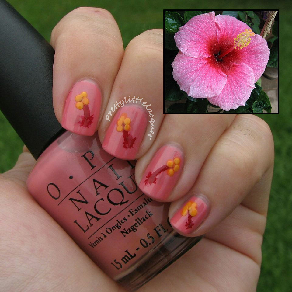 For the flower task I decided to depict a hibiscus flower. I began with two coats of OPI A Dozen Rosas (appropriate for flower nail art). For the style and flower center I used OPI Little Red Wagon. For the pollen I used OPI The “It” Color.